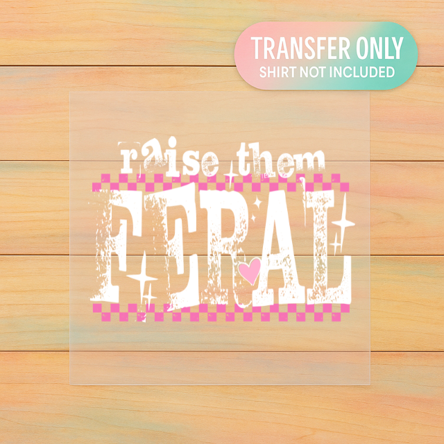 This “Raise Them Feral” DTF transfer brings humor and honesty to everyday chaos — bold white lettering with pink checker accents make it cute and chaotic in the best way. Perfect for busy moms, tired mamas, and boutique mom-life tees.