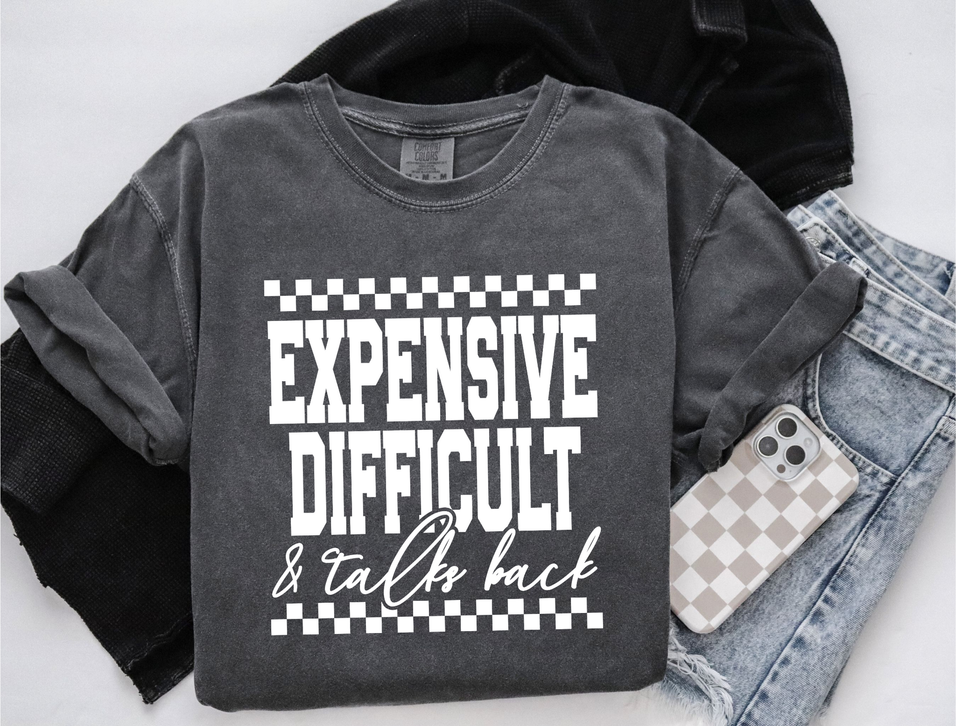 This Adult Size “Expensive and Difficult” DTF Transfer is perfect for creating funny, sassy statement tees. With a trendy checkered background and bold lettering, this design makes the ultimate sarcastic shirt for wives, girlfriends, or anyone who loves humor fashion. (Shirt not included.)