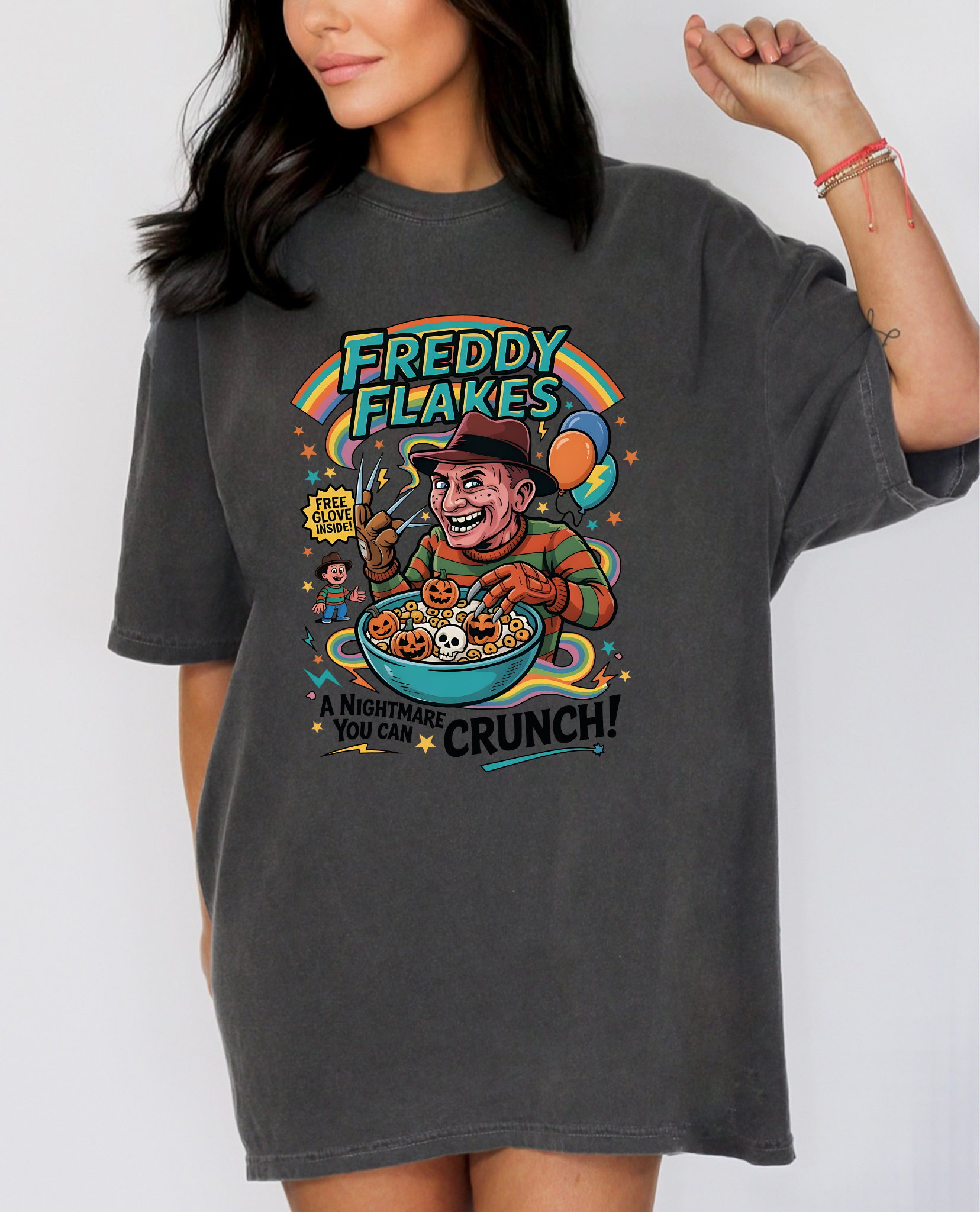 Bring spooky fun to your Halloween tees with our FREDDY FLAKES DTF transfer – a creepy cereal box parody design that’s perfect for horror fans! This premium Direct-to-Film transfer is ready to press and gives a professional, long-lasting finish on any shirt.