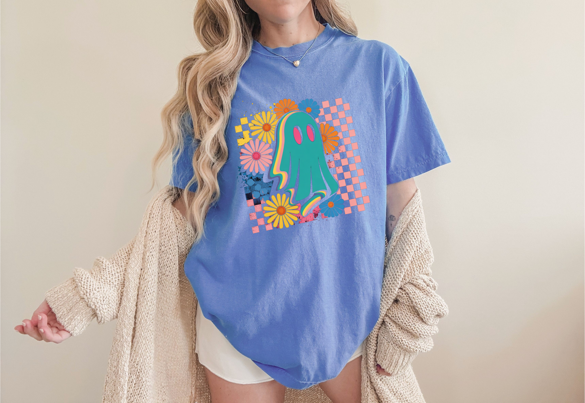 Retro groovy ghost with checkered & floral accents πΈ