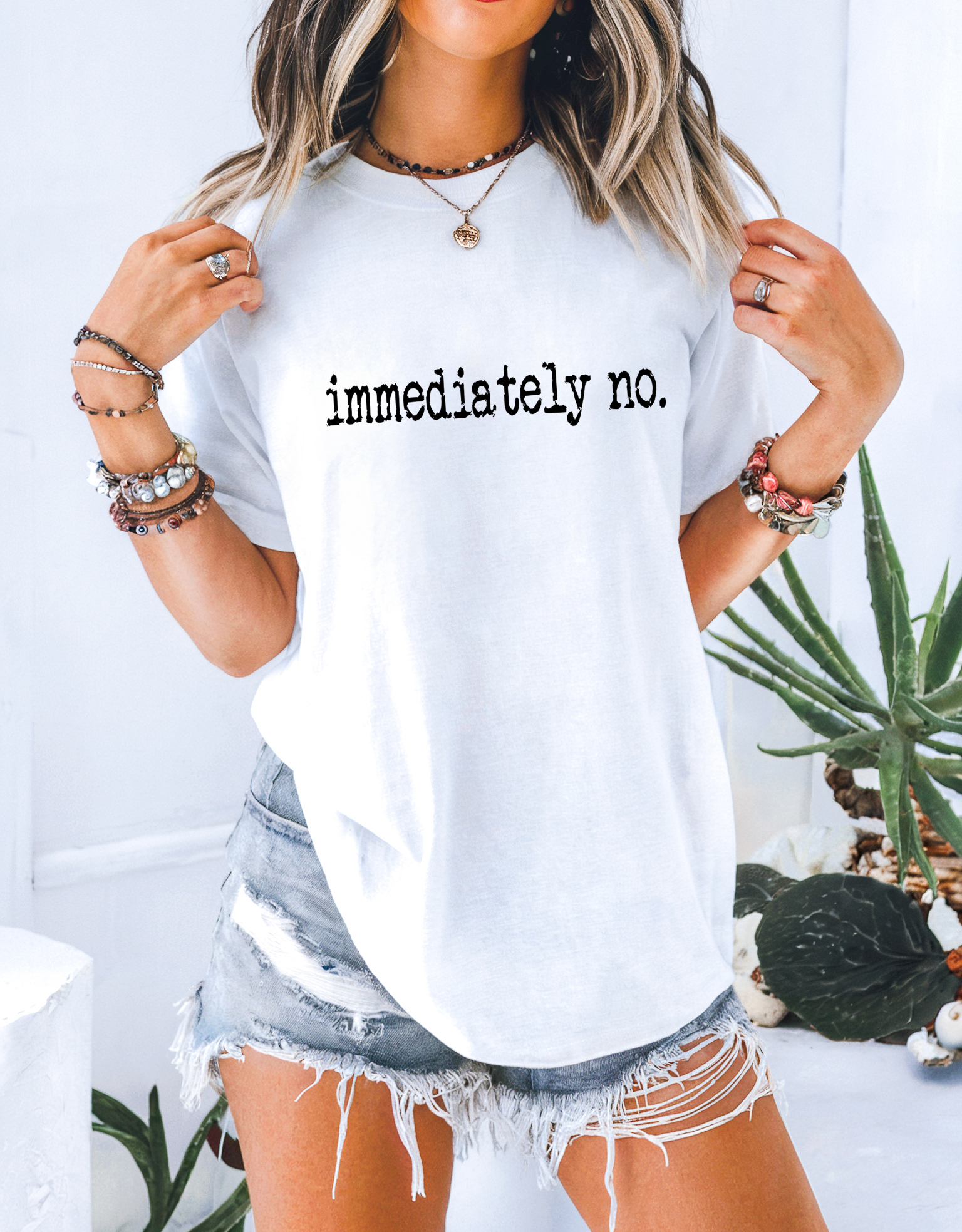 🙅♀️ Sometimes the answer is crystal clear — “Immediately No.” This bold black lettering DTF transfer makes the perfect statement tee for everyday wear, coffee runs, or nights out with friends. Clean, crisp, and ready to press in seconds.