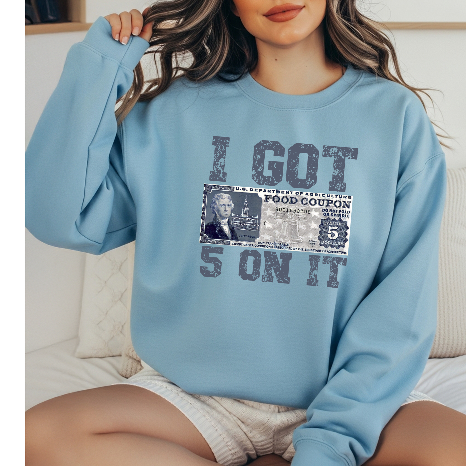 I Got My Five is the perfect blend of vintage and funny — featuring a retro-style food stamp design with distressed lettering that gives major old-school vibes. A hilarious throwback for boutique humor tees or market drops that stand out.